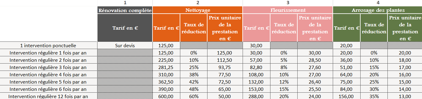 - Le nettoyage : le tarif est dégressif en fonction de la fréquence d’intervention choisie